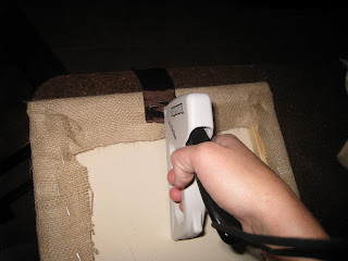 to staple the burlap around the back of each canvas. I started at the top and bottom by pulling tight and stapling as I went (so easy).